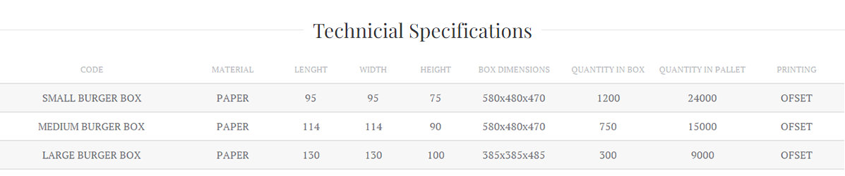Burger Boxes in 3 main sizes are available. It is possible to produce burger boxes in different types of paper like kraft/kraft , CKB and bristol. With an high tecnology ofset printing machine your customization on burger boxes will add value to your packagings.