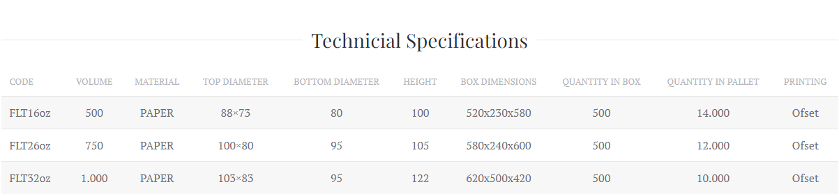 We supply 16oz, 26oz, 32oz paper food boxes with high quality ofset printing. 75mm and 95mm are our fixed bottom diameters and It is possible to develop new sizes with only changing heights of the cups.